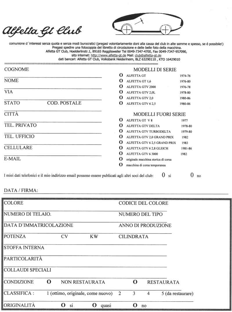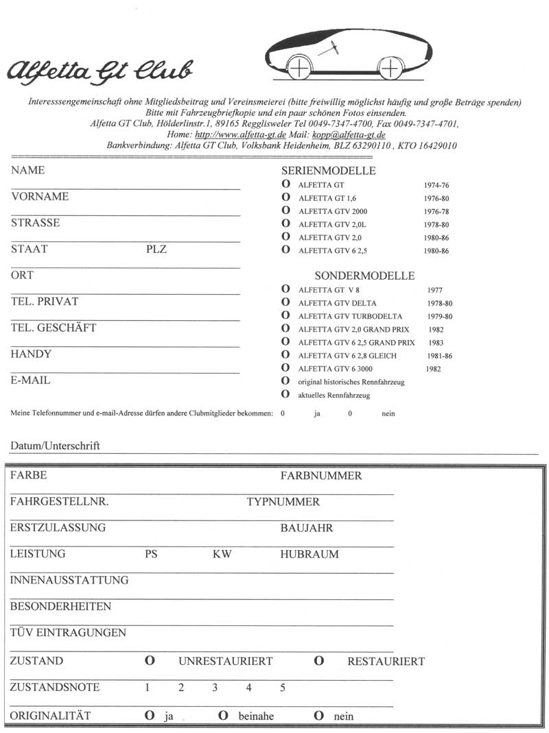 Dieses Anmeldeformular zum Alfa Romeo ALFETTA GTV-Register bitte möglichst vollständig ausfüllen und abschicken: